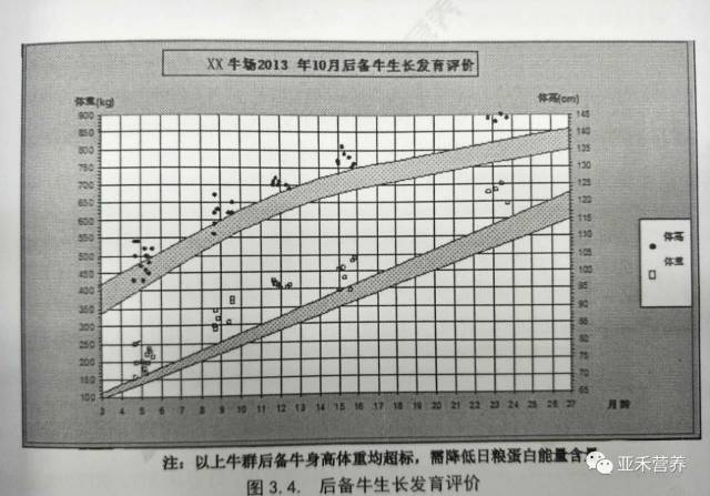 圖3.4中的后備牛體尺曲線圖中有兩個區(qū)域,上面是標準體高區(qū)域圖,下面是標準體重區(qū)域圖,只有當體高和體重的測量值分別落在格子的區(qū)域范圍內(nèi)時才是最合理的,發(fā)現(xiàn)偏高或偏低都應該分析偏離值及牛只偏高的所占比例,存在問題,及時采取有限措施調(diào)整日糧方案,確保后備牛正常發(fā)育。